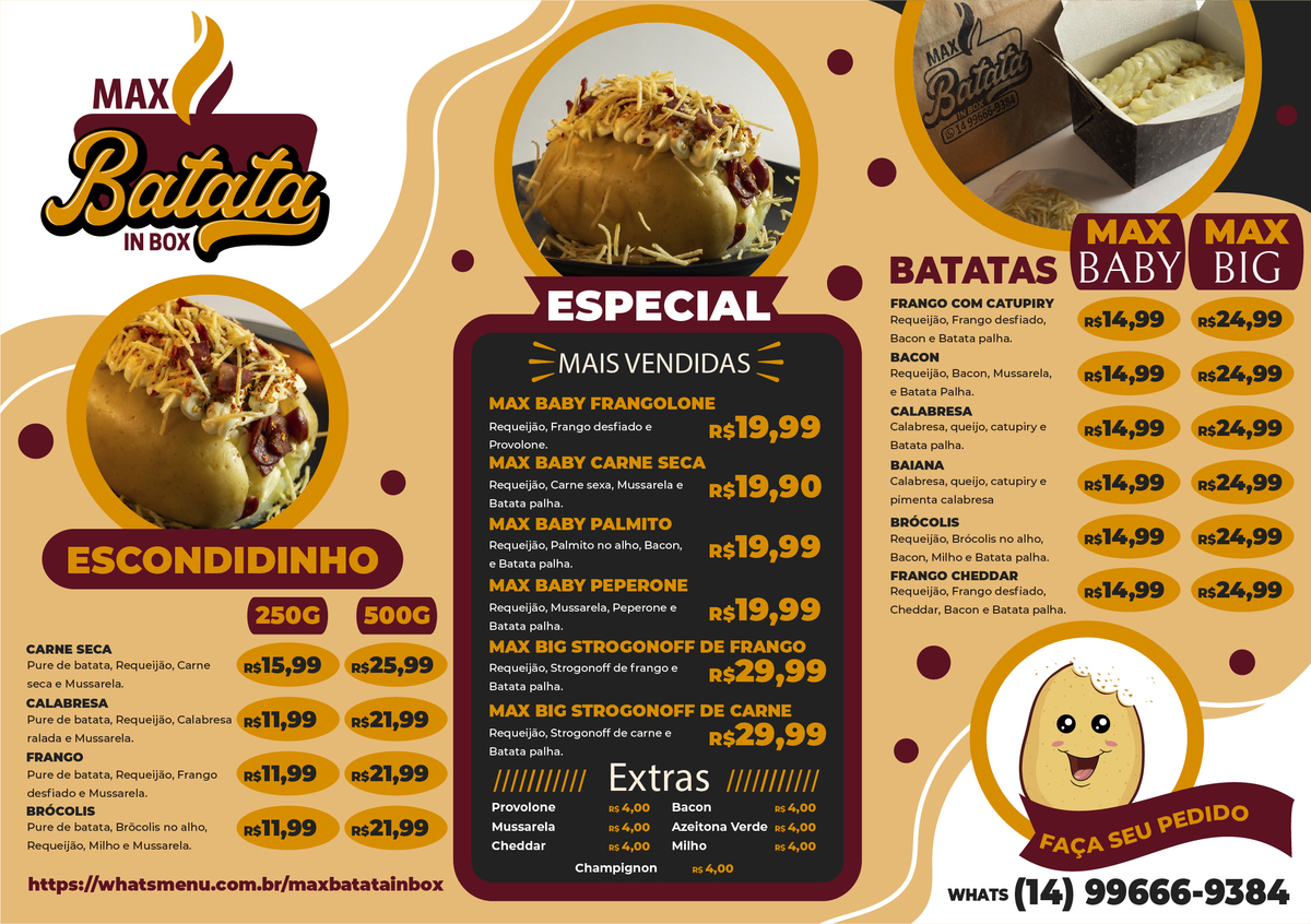Desenvolvimento de marca, mascote, fotos e cardápio para Max Batata in box.