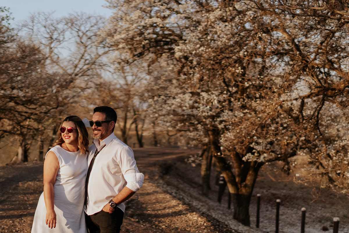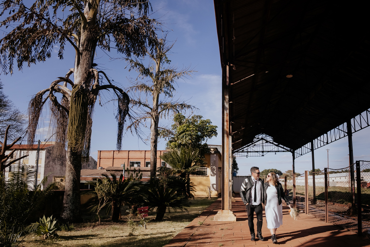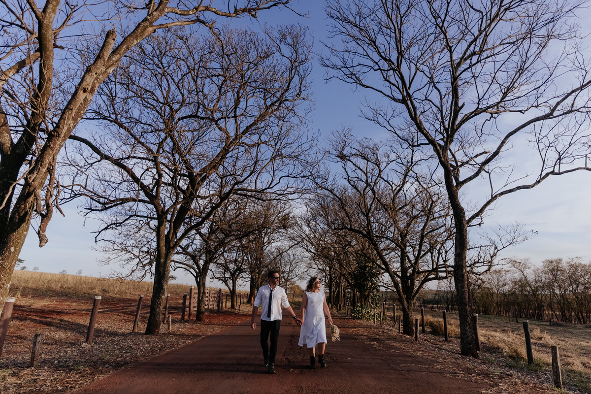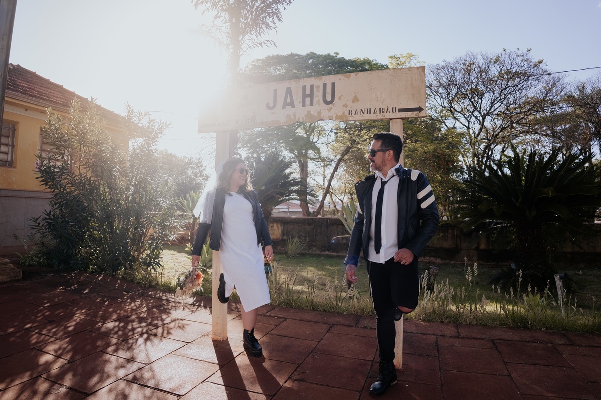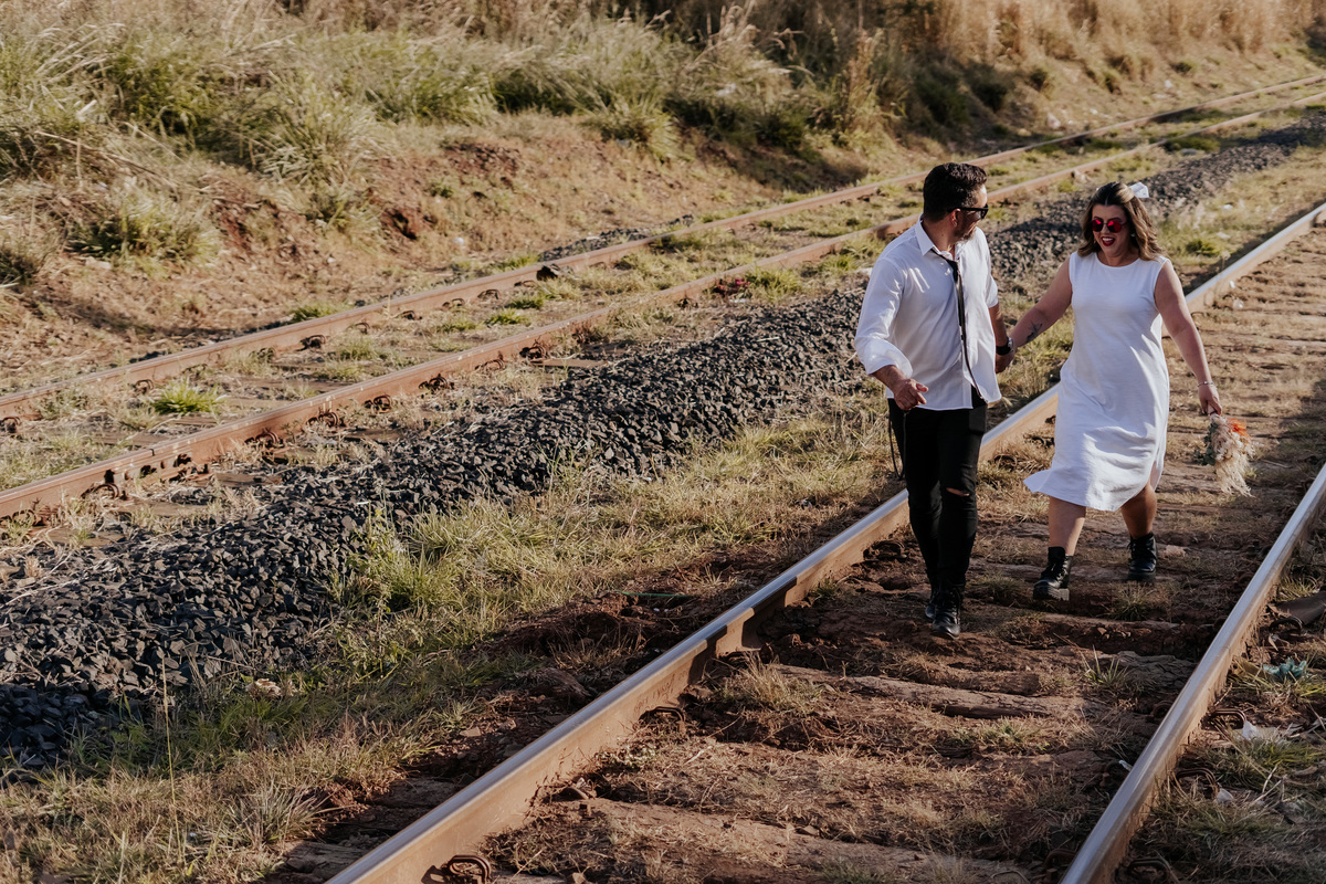 Começamos na antiga estação de trem de Jaú, onde a conexão entre os dois fluía de forma leve e natural — exatamente como gosto de fotografar: sem pose, só verdade. Depois seguimos pelas linhas do trem, até um caminho cercado por árvores e folhagens caídas, com um pôr do sol que parecia feito sob medida pra eles.
