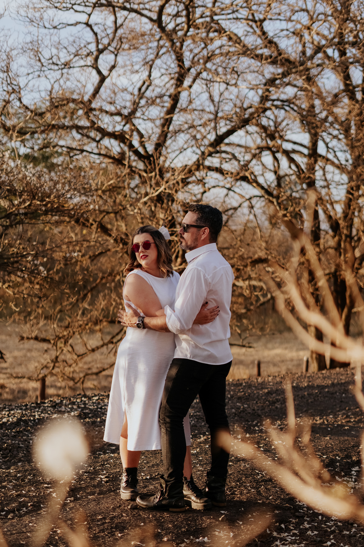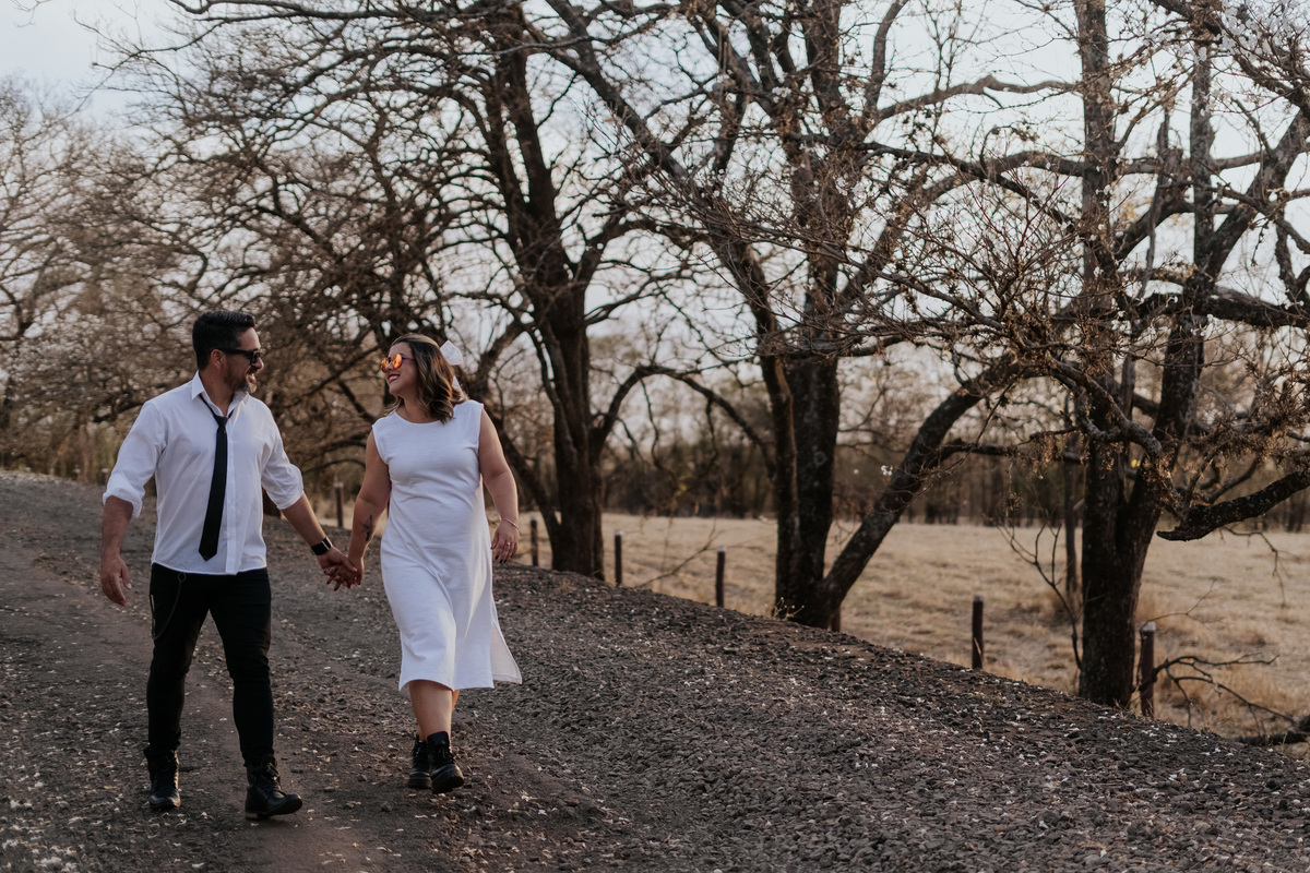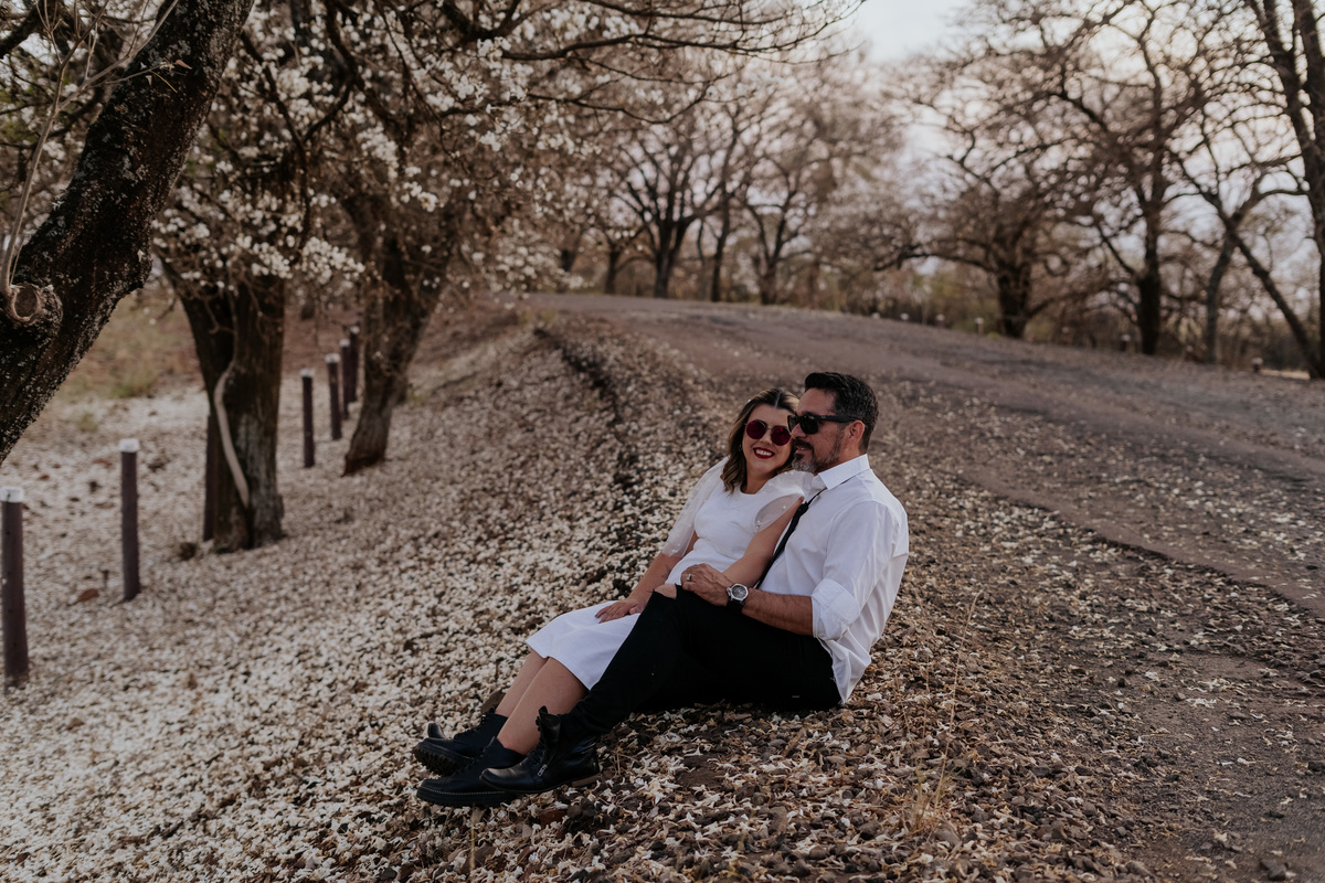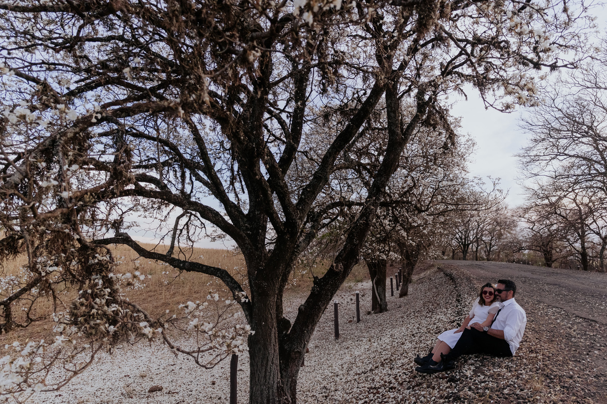 Começamos na antiga estação de trem de Jaú, onde a conexão entre os dois fluía de forma leve e natural — exatamente como gosto de fotografar: sem pose, só verdade. Depois seguimos pelas linhas do trem, até um caminho cercado por árvores e folhagens caídas, com um pôr do sol que parecia feito sob medida pra eles.