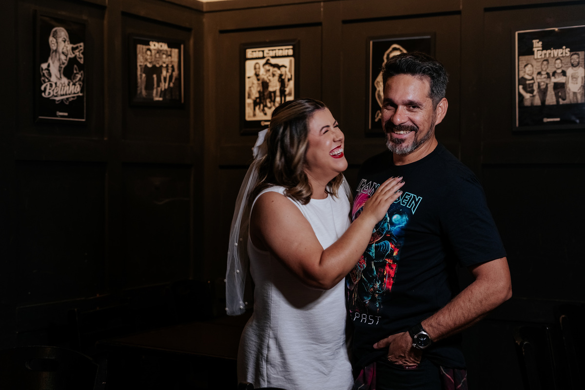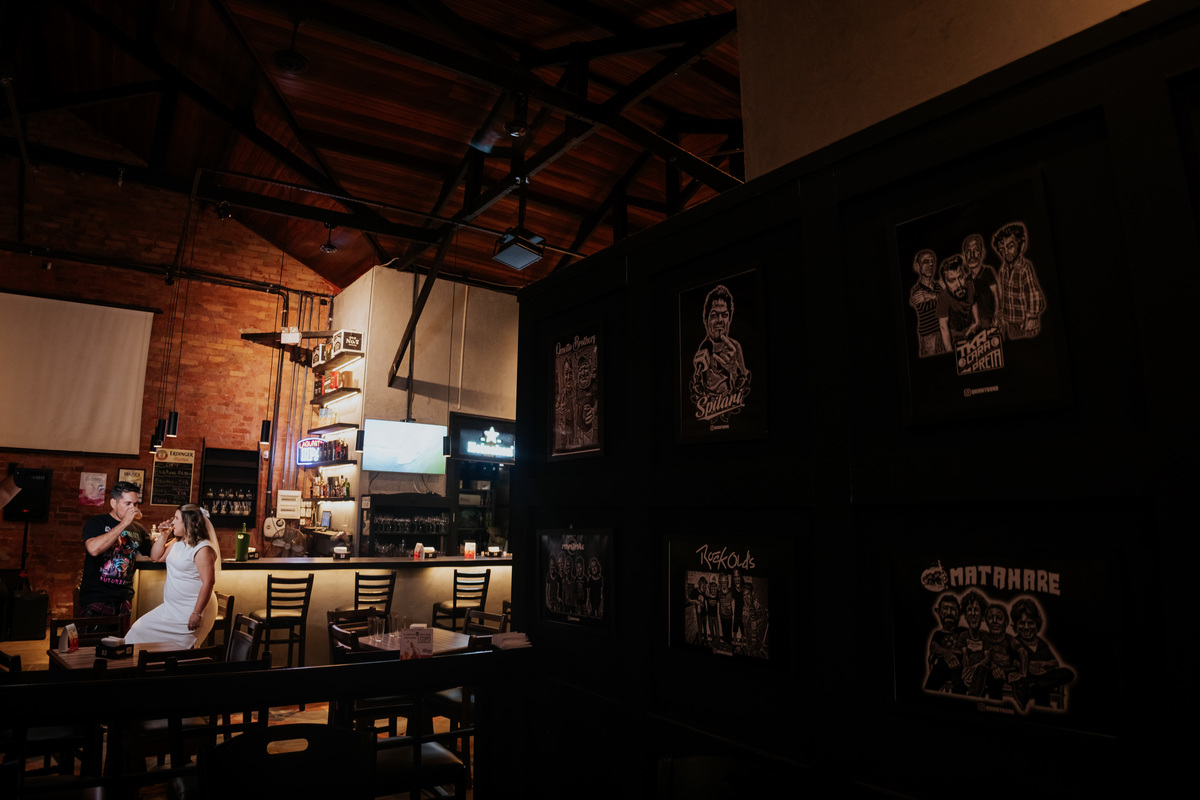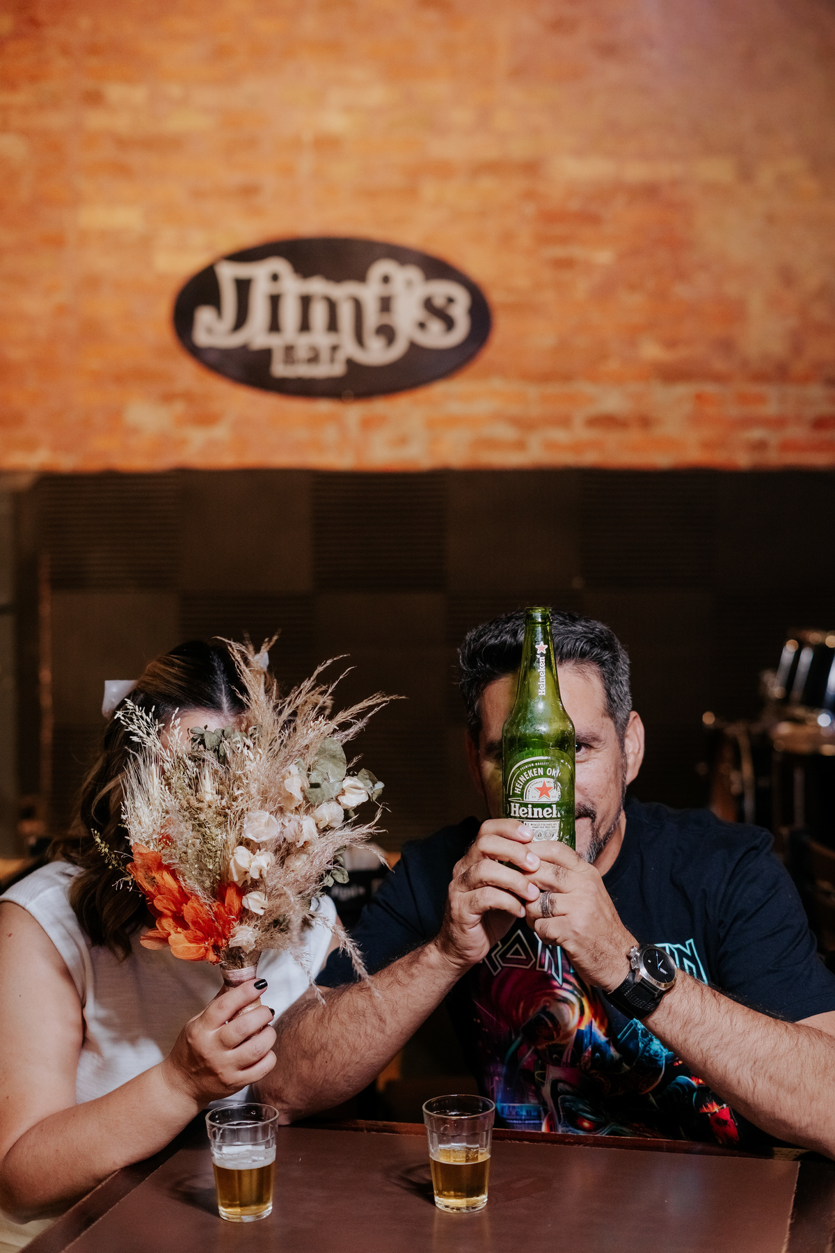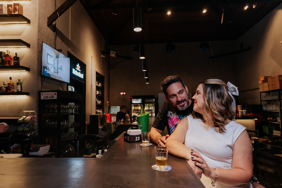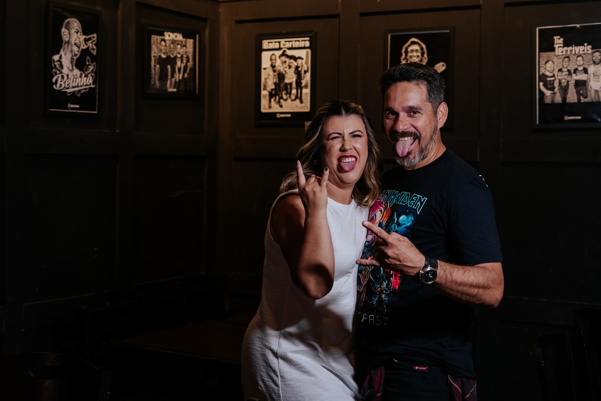 E pra fechar com a essência que define esse casal, terminamos o ensaio no bar que eles mais frequentam — com risadas, música e um toque de rock and roll no ar.