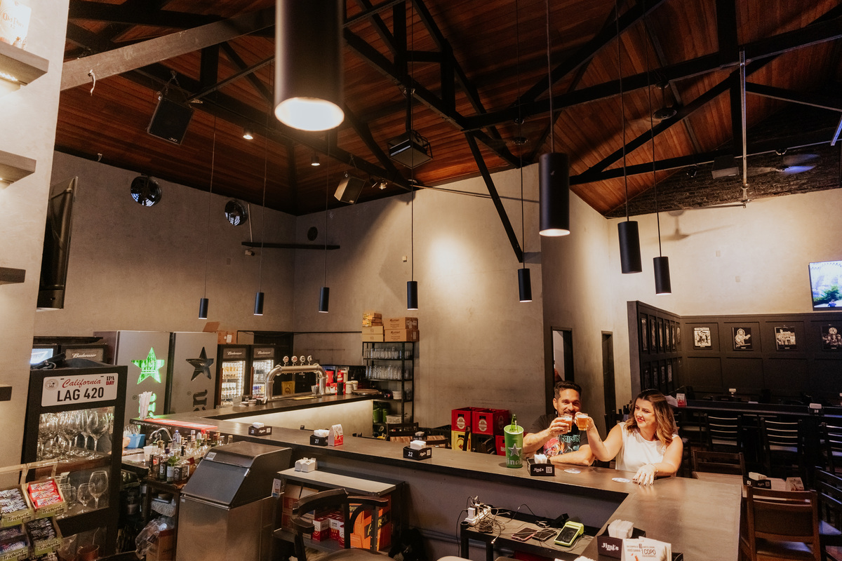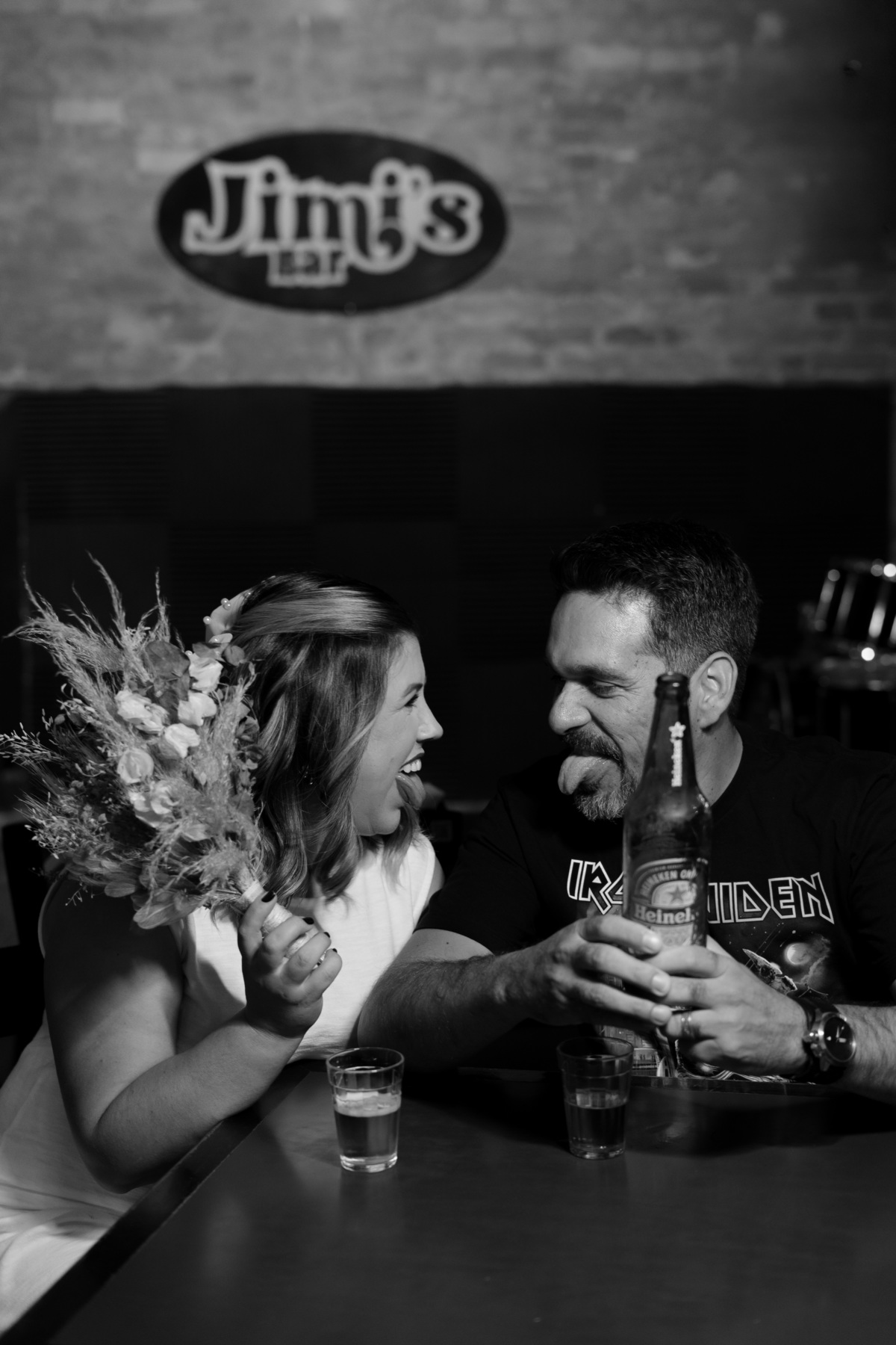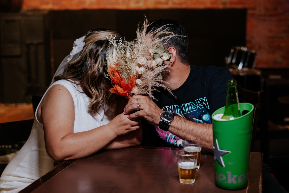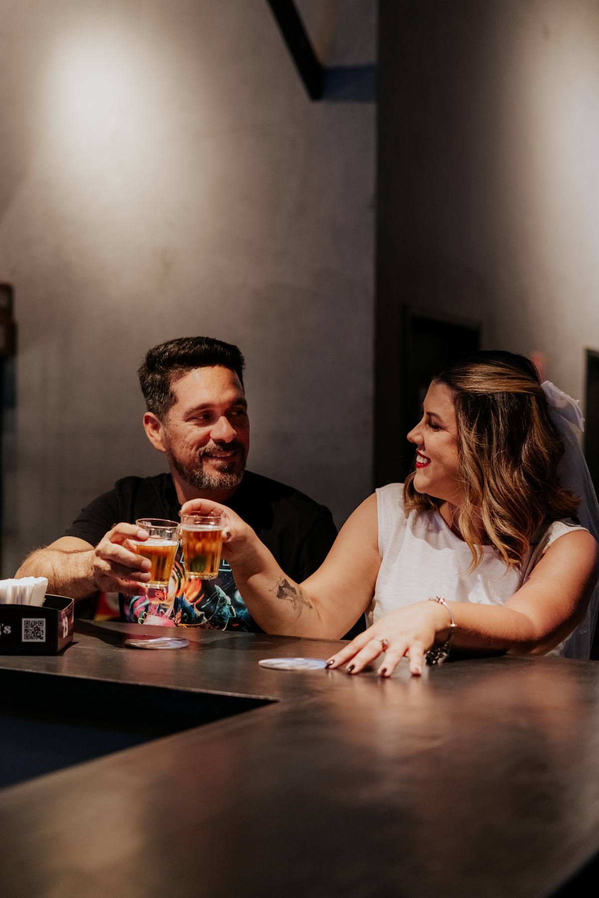 E pra fechar com a essência que define esse casal, terminamos o ensaio no bar que eles mais frequentam — com risadas, música e um toque de rock and roll no ar.